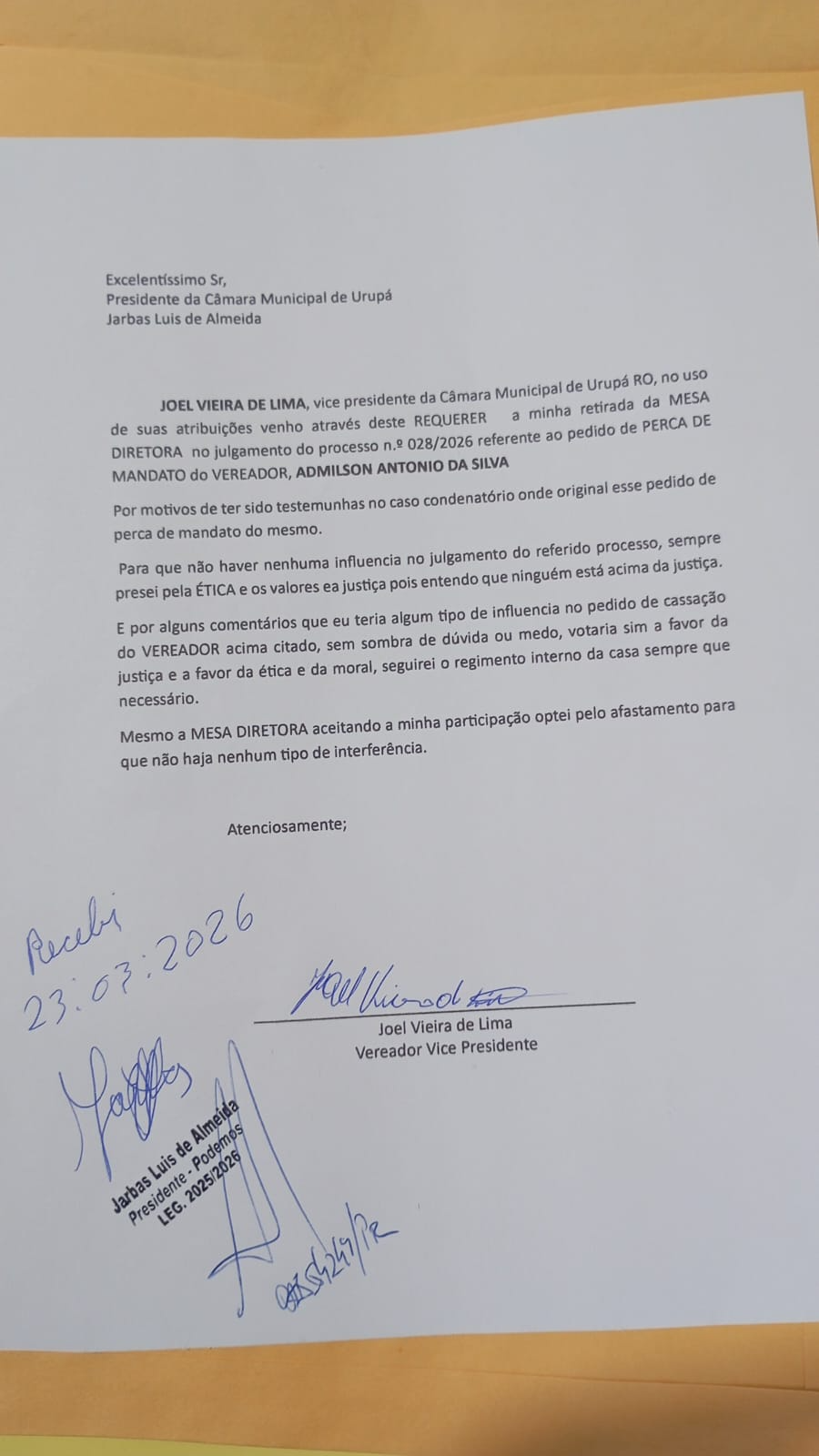 Que, após manifestação da mesa, esta recebeu petição do Vereador Joel Vieira de Lima requerendo o seu afastamento da Mesa Diretora para o julgamento do processo 028/2026; Que, por unanimidade, em sede de Preliminar de Mérito, a Mesa Diretora deliberou pelo INDEFERIMENTO do pedido de cassação do mandato do Vereador Ademilson Antonio da Silva, proposto pelo Sr. Gilmar Gomes dos Santos.